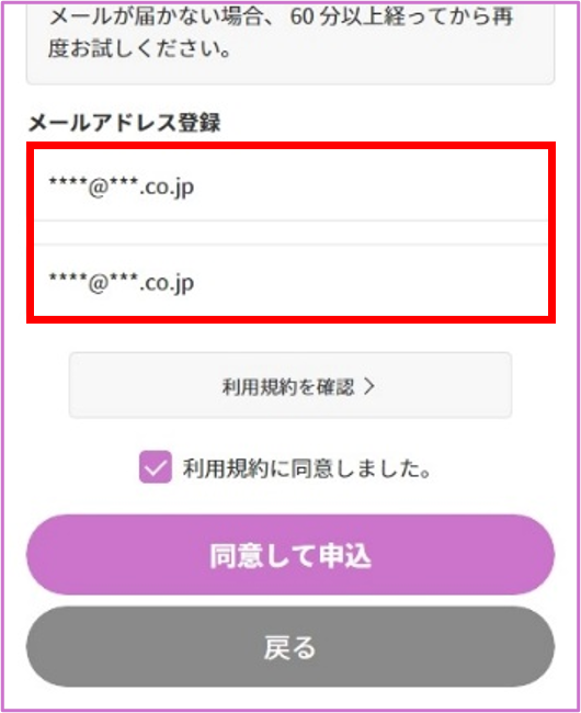 メールアドレスを入力、利用規約を確認し「同意して申込」をタップ