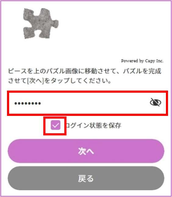 設定したパスワードを入力し、「ログイン状態を保存(推奨)」にチェックを入れて次へすすむ