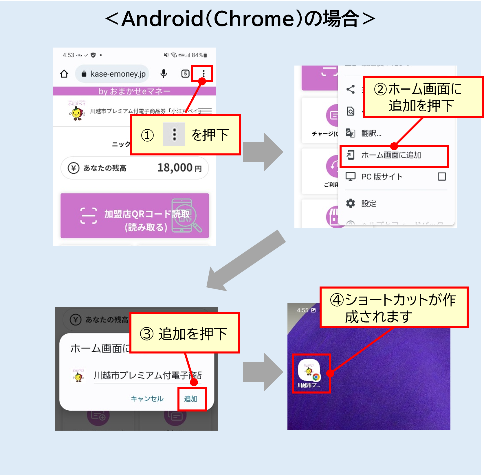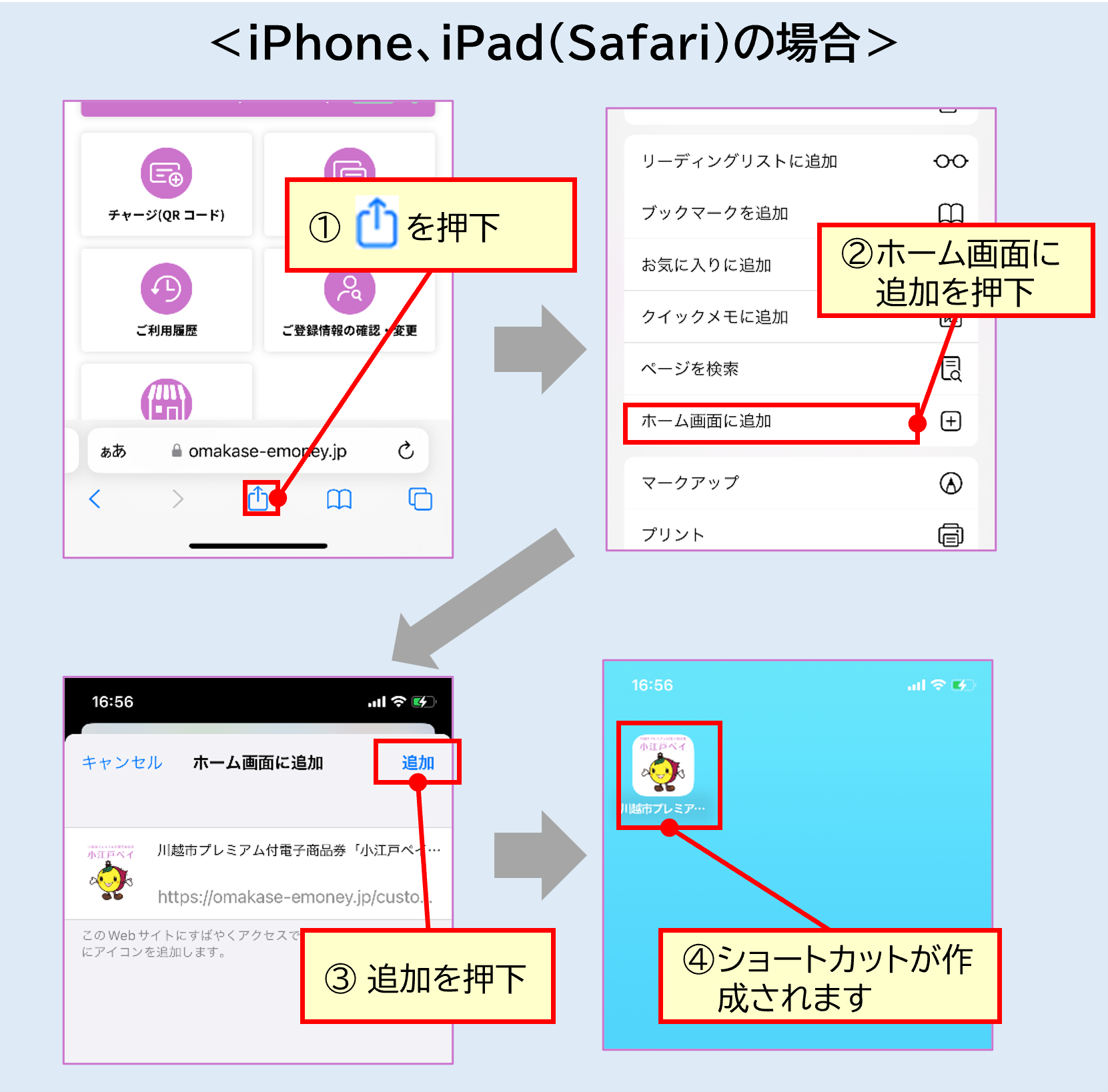 ホーム画面にショートカットを作成することで、次回以降簡単にトップ画面に戻ることができます。