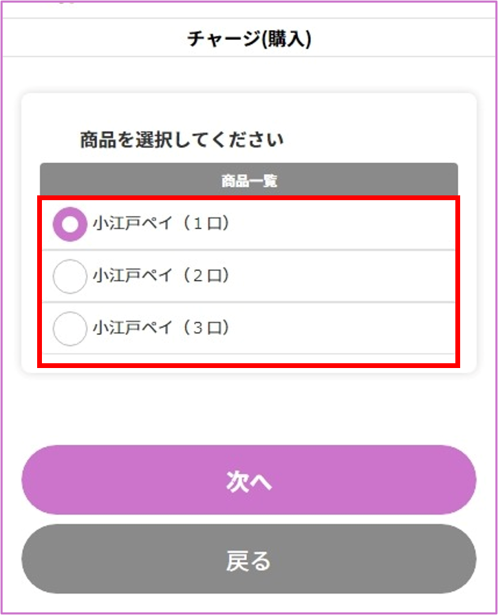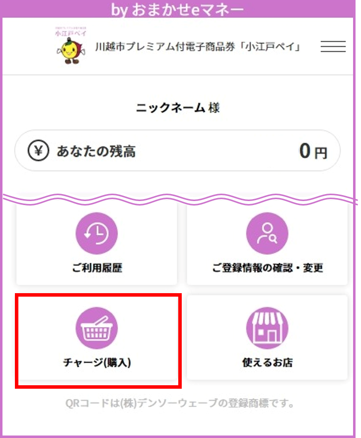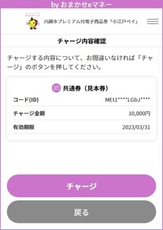 小江戸ペイにログインし、当選通知に記載されたパスワードを入れて商品券を購入(チャージ)します。