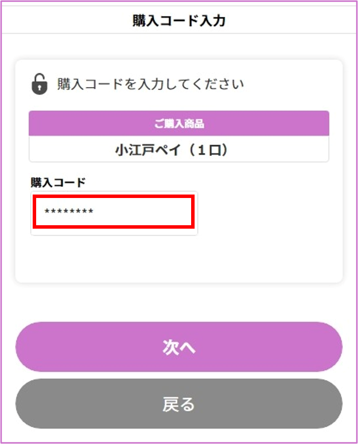 当選通知に記載されている「購入コード」を入力