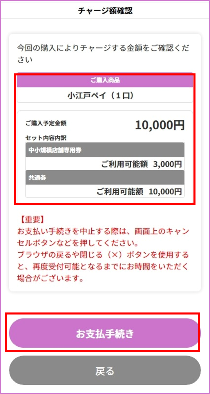 チャージ内容を確認し、お支払い手続きをタップ