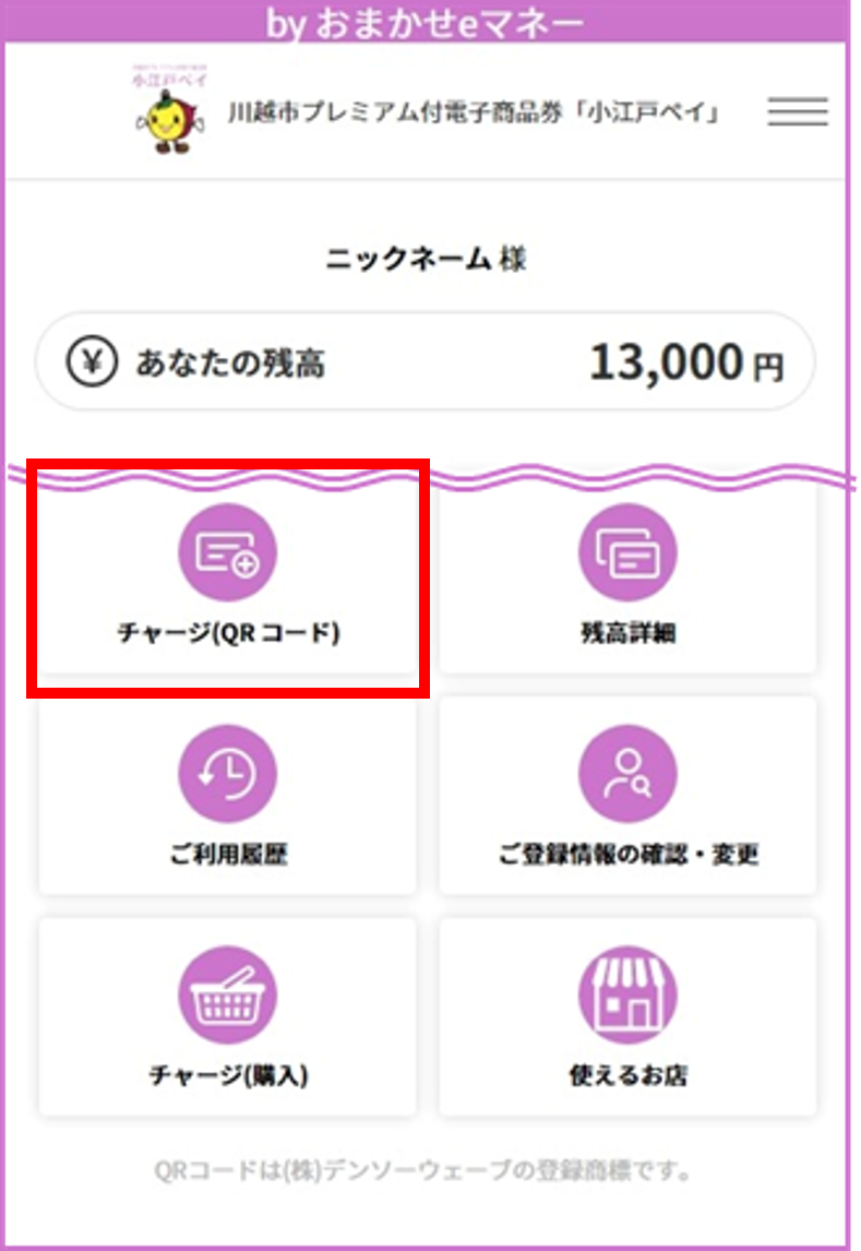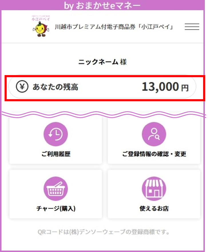 TOP画面の残高が増えればチャージ完了です