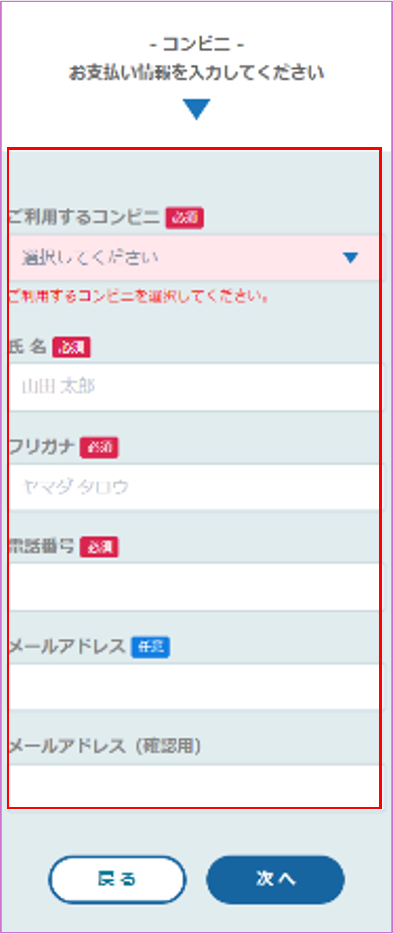 ご利用するコンビニを選択し、必要事項を入力し次へをタップ