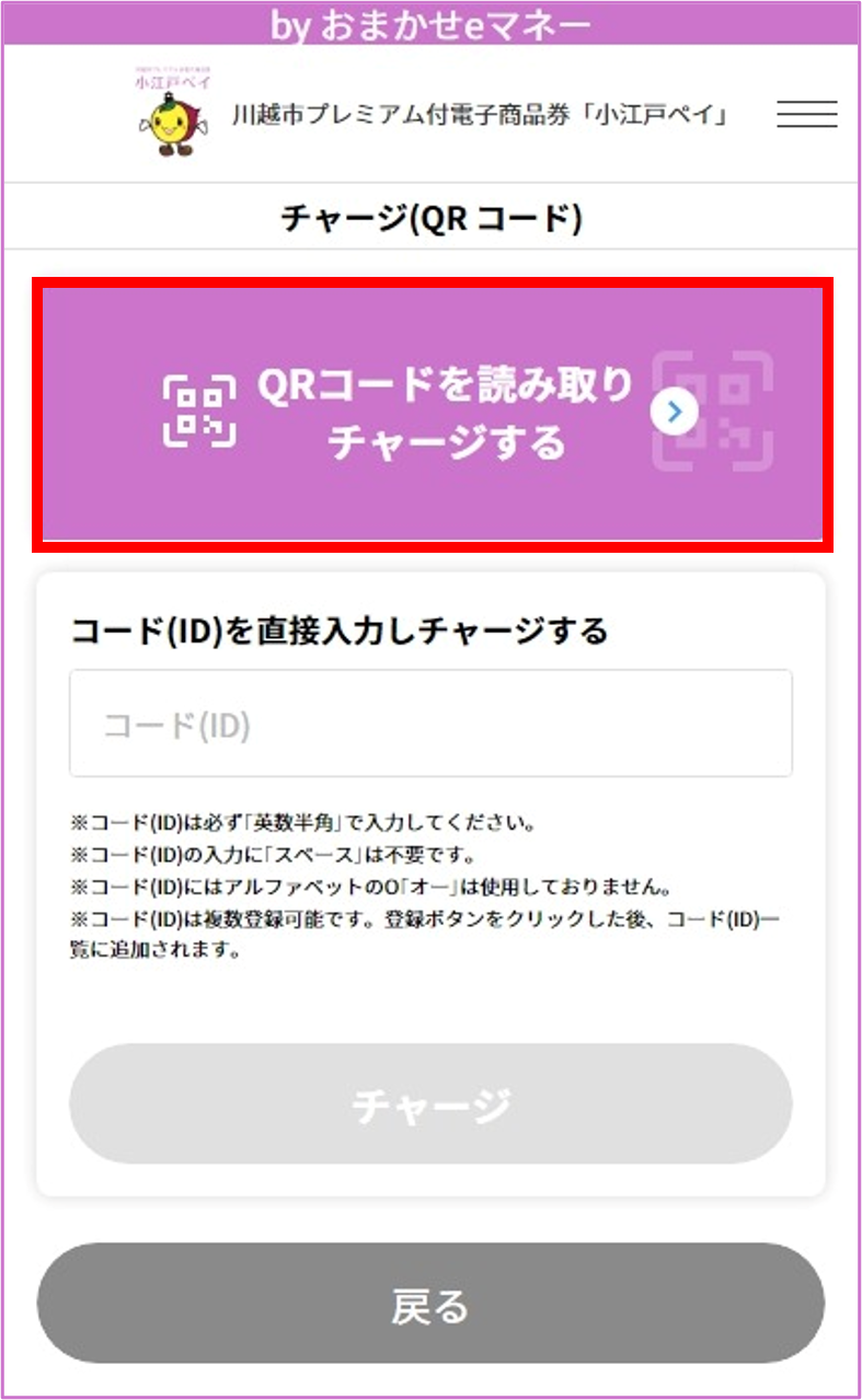 QRコードを読み取りチャージするをタップ