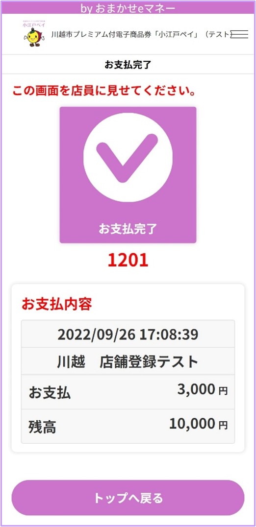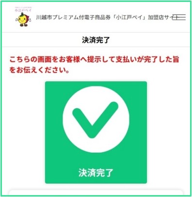 支払い完了画面が表示されるので、店員に見せてお支払い完了です