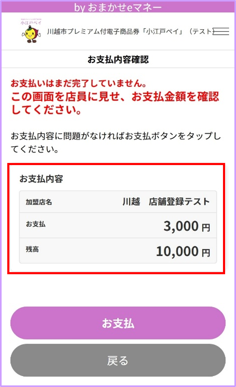 支払内容確認画面を店員に見せ、お支払をタップ