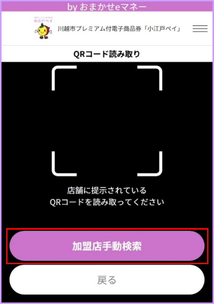 QRコード読み取り画面で「加盟店手動検索」をタップ