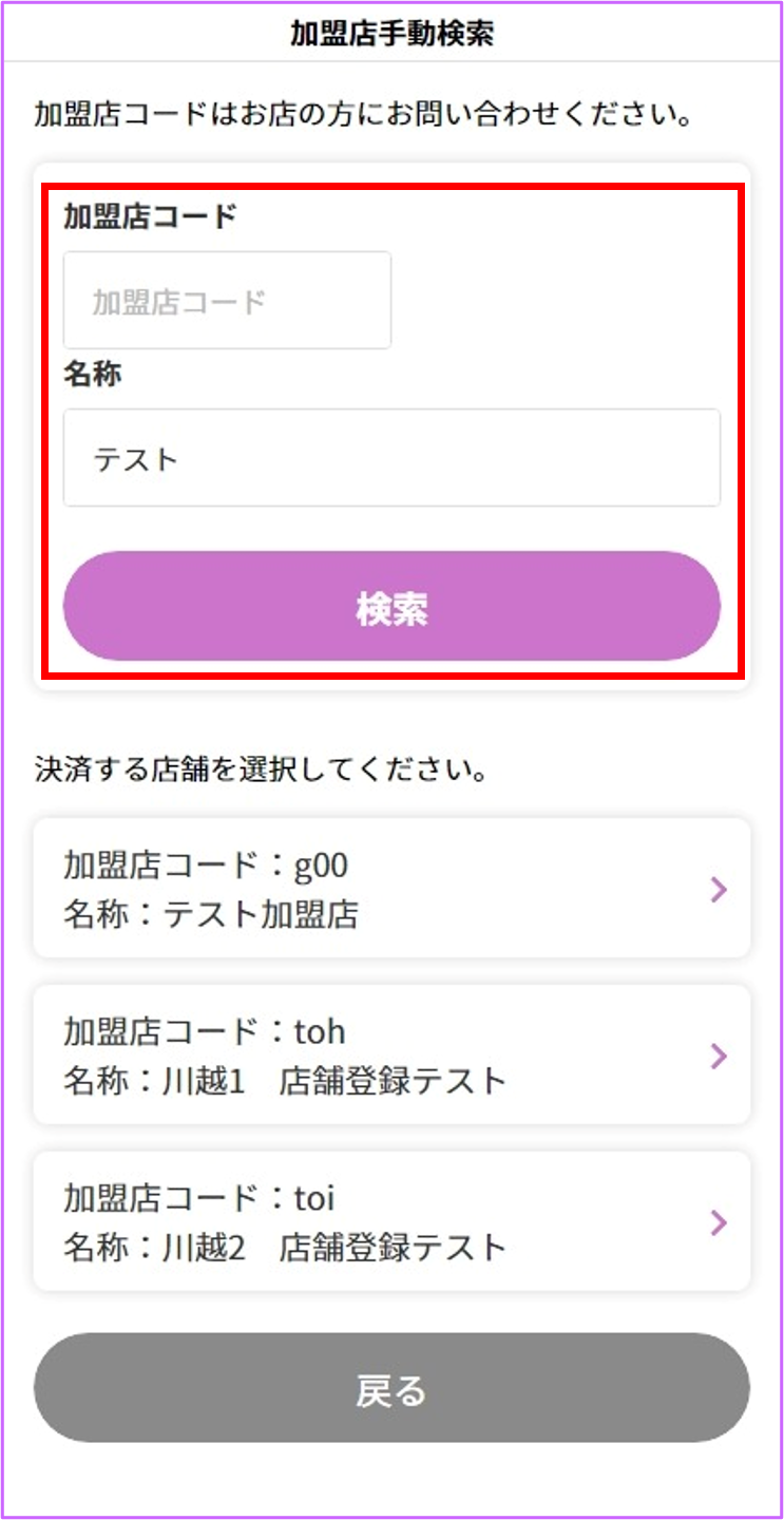 加盟店コードもしくは店舗名(※)で検索、お支払いする店舗を選択します