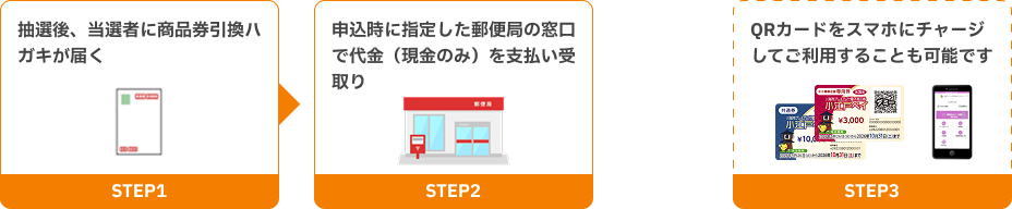 申込時に指定した郵便局の窓口で代金(現金のみ)を支払い、商品券をお受け取り下さい。