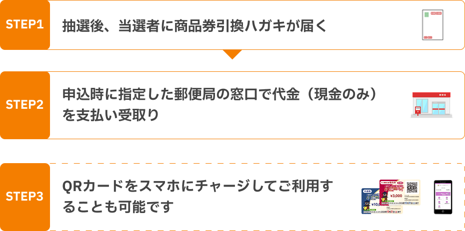 申込時に指定した郵便局の窓口で代金(現金のみ)を支払い、商品券をお受け取り下さい。
